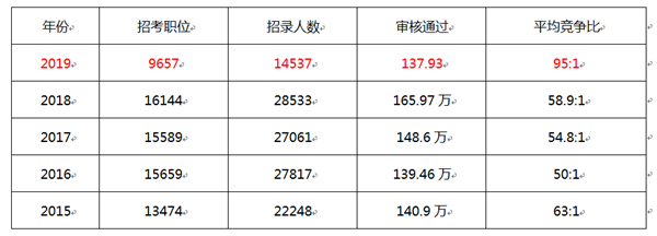 2019年國考,平均競(jìng)爭(zhēng)比已達(dá)95:1,為近五年最高,約為2018年國考的1.6倍,2016的2倍。